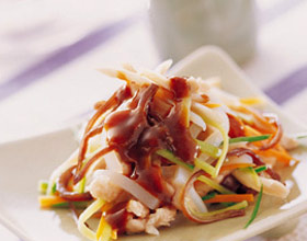鸡丝蘑芋豆腐:'1.葱切成3厘米长的段;2.香菇去蒂洗净,和火腿都切成丝;3.将鸡脯肉筋剔去,切成5厘米长的细丝,用鸡蛋清、干淀粉10克、适量的盐调匀浆好;4.将蘑芋豆...    详细介绍
