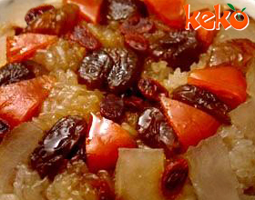 八宝饭:'1.将青梅、核桃仁切成小丁;2.山楂糕切条;3.猪板油温水洗净切条待用;4.将糯米拣净杂质淘洗后,在锅里加水500毫升烧开,放进白糖,再将洗净的糯米放...    详细介绍