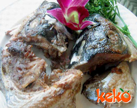 香烤鱼头王:'1.鲢鱼头去鳃洗净,由鱼颌部用刀劈开成一大扇形,放盆中加鱼汁,葱姜腌2小时。2.鱼头皮朝下放烤盘中加大蒜瓣,入烤箱急火烤10分钟,取出刷鱼汁,葱椒...    详细介绍