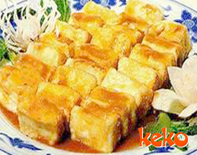 9.锅置旺火上,放入熟猪油烧至五成热,将豆腐坯沾匀蛋泡糊,逐个下入油锅炸至挺起捞出;