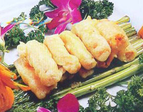 脆皮鱼卷:'1.草鱼宰杀,去鳞、内脏,片取净肉切5 厘米长,筷子粗细的条;2.肥膘肉切5 厘米长丝;3.冬笋削去外皮,洗净,切5 厘米长丝;4.香菇去蒂,洗净,切5 厘...    详细介绍