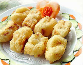 炸鲜奶:'1.牛奶入铜锅上火,加菠萝香精0.1克、黄油、白糖,烧开锅后下100毫升,水淀粉勾芡,用木铲顺一方向搅动;2.待牛奶变稠后倒入刷黄油的方盘内,稍凉后,...