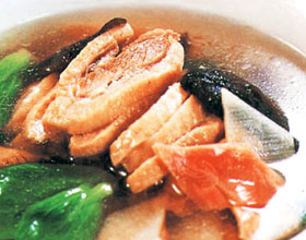 清蒸烧鸭块:'1.将北京烤鸭去掉筒子粗骨,剁成3厘米宽、4厘米长的块,装汤盘内;2.放入盐、料酒、拍破的葱、姜和水(水以没过鸭块为准),上笼蒸约3小时,蒸至酥烂...    详细介绍