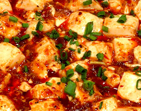 麻婆豆腐:'1.豆腐切成2厘米见方的小块,用热水氽过,备用。2.炒锅中倒入油,猪肉(绞碎)用辣豆瓣酱、姜末炒酥,倒入高汤与豆腐、酱油、味精、酒以小火同煮。3....