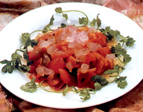 西红柿拌芦荟:'西红柿洗净去蒂,切成块,装入盆内;芦荟叶肉取出,在开水煮5分钟捞出,切成丁铺在番茄上,香油、味精、鲜酱油、细香葱兑成汁,浇在面上即可。...