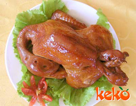 关记烧鸡:'1.选取每只重约1500克的鸡5只,宰杀,煺毛,在肛门处开一6 厘米长的小口,取出内脏,将鸡腿插入鸡腹中,将鸡头盘于翅下,依次盘好5 只鸡,晾一会备用...