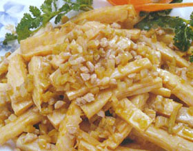 干煸冬笋:'1.将冬笋洗净,沥干水分,切成条;猪瘦肉切粒,榨菜洗净切粒。2.锅内注油烧热,放入冬笋炸至笋至淡黄色,捞出沥油。3.锅内留少许油,放入猪肉粒、冬笋...    详细介绍