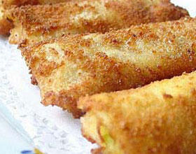 香蕉海鲜卷:'1.将虾仁,鲜贝,海参焯水剁细放盆中,加盐,味精,料酒,拌入卡夫奇妙酱(色拉酱)。将香蕉切成3厘米左右长的细条。用威化纸将拌好的料分成10分,取...