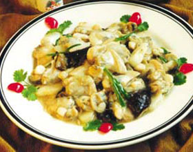 11.再将文蛤肉放入锅内,迅速颠炒,淋香油出锅装盘;