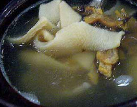 2.取出切小块,再放入清汤中,加入一些生姜、香葱、大蒜、精盐、胡椒、味精等,上火煮后,加入适量香菜,盛出,淋上一些香油即成。
