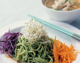 9.依个人口味选取适量的佐料,和面一起放在小碗中拌匀,这道面食色泽翠绿,在凉中透着清香,最宜夏天食用。