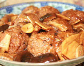 4.原勺洗净坐旺火攻热,放入猪油20克,炝大料,再放葱、姜、料酒、酱油、高汤、白糖、味精和盐,烧沸后将丸子下勺,用小火将丸子焖透,笋片、木耳、油菜用沸水焯一下过凉,待汤汁浓稠时,即可放入勺内,上旺火,勾芡,淋猪油和少许香油,将丸子盛入大汤盘,再把汁浇上即成。