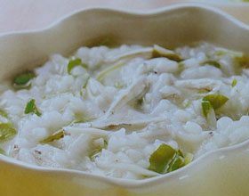 4.粥将熬好时,放入银鱼及芥菜末,以旺火同煮片刻,然后加盐调好味,即可盛起食用。
