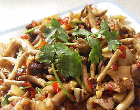 柳松茸烧冬笋:'1.柳松茸、冬笋以开水浸泡后切片。2.锅内放油加热至六分热,放入冬笋、柳松茸、火腿(切片)略炸后捞起,沥去油。3.在锅内加蒜(切末)、葱(切末)、...    详细介绍