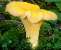 鸡油菌子实体肉质,喇叭形,杏黄色至蛋黄色,菌肉蛋黄色,香气浓郁,具有杏仁味,质嫩而细腻,鲜美,又名鸡蛋黄、杏菌。菌盖直径3~9厘米,最初扁平后下凹,边缘波状,常裂开内卷。菌柄内实,光滑,长2~6厘米,直径0.5~1.8厘米。