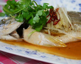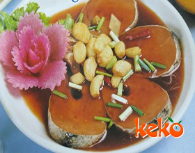 侉炖鱼:'1.把鱼放在开水内烫一下捞出,刮去全身的浮皮,洗净剞上交叉的斜刀口;葱、姜均切成块;冬笋、香菇均切成片;肥膘肉剞成交叉花刀。2.勺内放猪油,用葱...    详细介绍